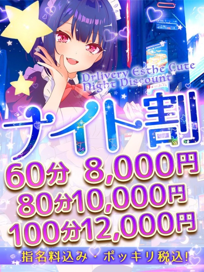 お仕事帰りに★お得なイベント 『 ナイト 割 』 時間帯の制限なし 60分8000円 80分10000円 100分12000円 ※別途ホテル代※ ※ご不明点はお気軽にスタッフに...